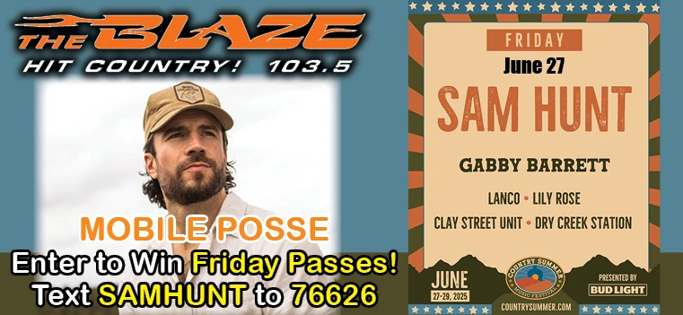 Play our sweepstake for a chance to win a pair of tickets to see Sam Hunt, Gabby Barrett, Lanco, Lily Rose, Clay Street Unit, and Dry Creek Station. Text SAMHUNT to 76626 .