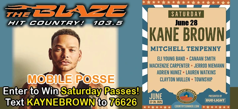 Play our sweepstake for a chance to win a pair of tickets to see Kane Brown, Mitchel Tenpenny, Eli Young Band, Canaan Smith, MacKenzie Carpenter, Jerrod Niemann, Adrien Nunez, Lauren Watkins, Clayton Mullen, and Township. Text KANEBROWN to 76626 .