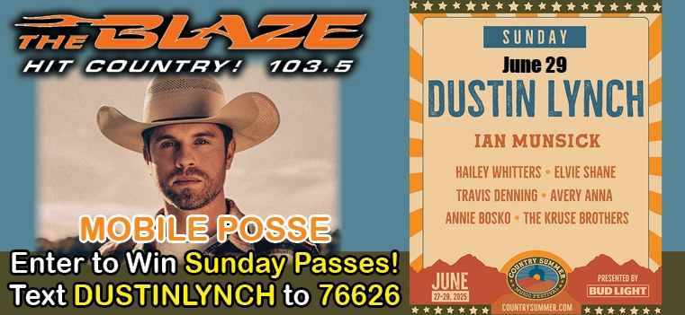 Play our sweepstake for a chance to win a pair of tickets to see Dustin Lynch, Ian Munsick, Hailey Whitters, Elvie Shane, Travis Denning, Avery Anna, Annie Bosko, and The Kruse Brothers. Text DUSTINLYNCH to 76626 .