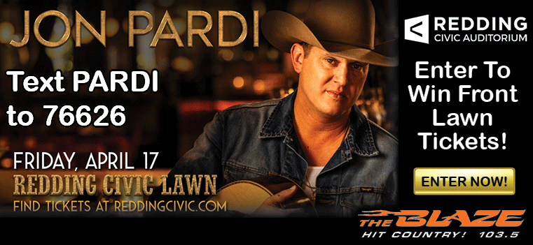 TEXT PARDI to 76626 Play our sweepstake for a chance to win a pair of front lawn tickets to see Jon Pardi at Redding Civic Auditorium. contest starts March 30