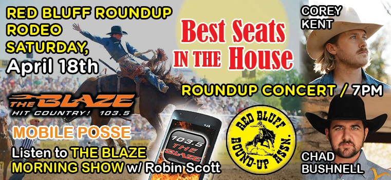 The VIP Package includes: Two Tickets to Skybox Seats at the Red Bluff Round-Up April 18th, includes FREE VIP Parking, and two tickets to the Cori Kent w/ Chad Bushnell concert.