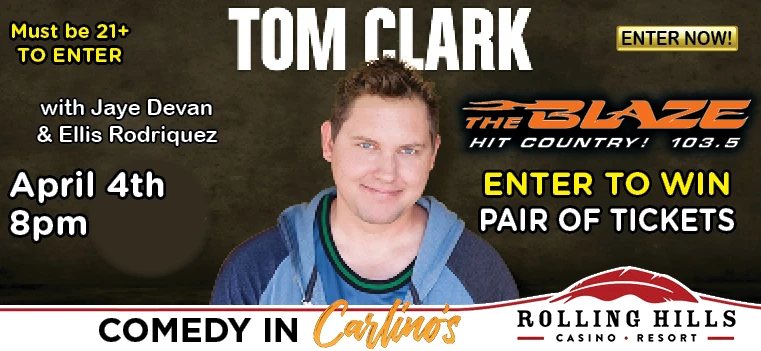 Qualify to win a pair of tickets to Tom Clark -comedy at Rolling Hills Casino Resort / Comedy in Carlinos, in Corning.