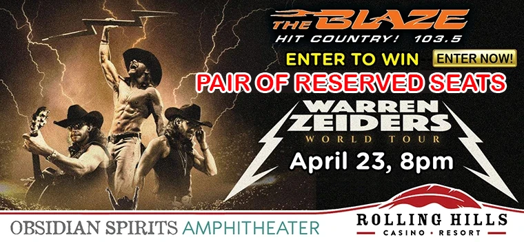 Play our sweepstake for a chance to win a pair of RESERVE TICKETS to see Warren Zeiders with special guest Lakeview at Rolling Hills Casino Resort / Obsidian Spirits Amphitheater, Corning.